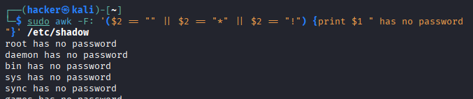 sudo awk -F: '$2==""' /etc/shadow Empty passwords Find passwordless accounts